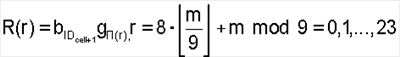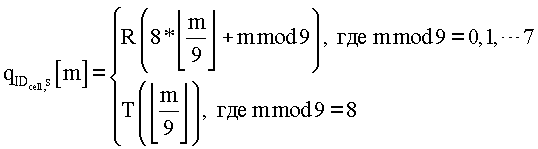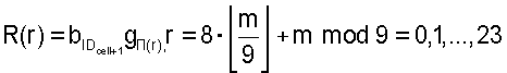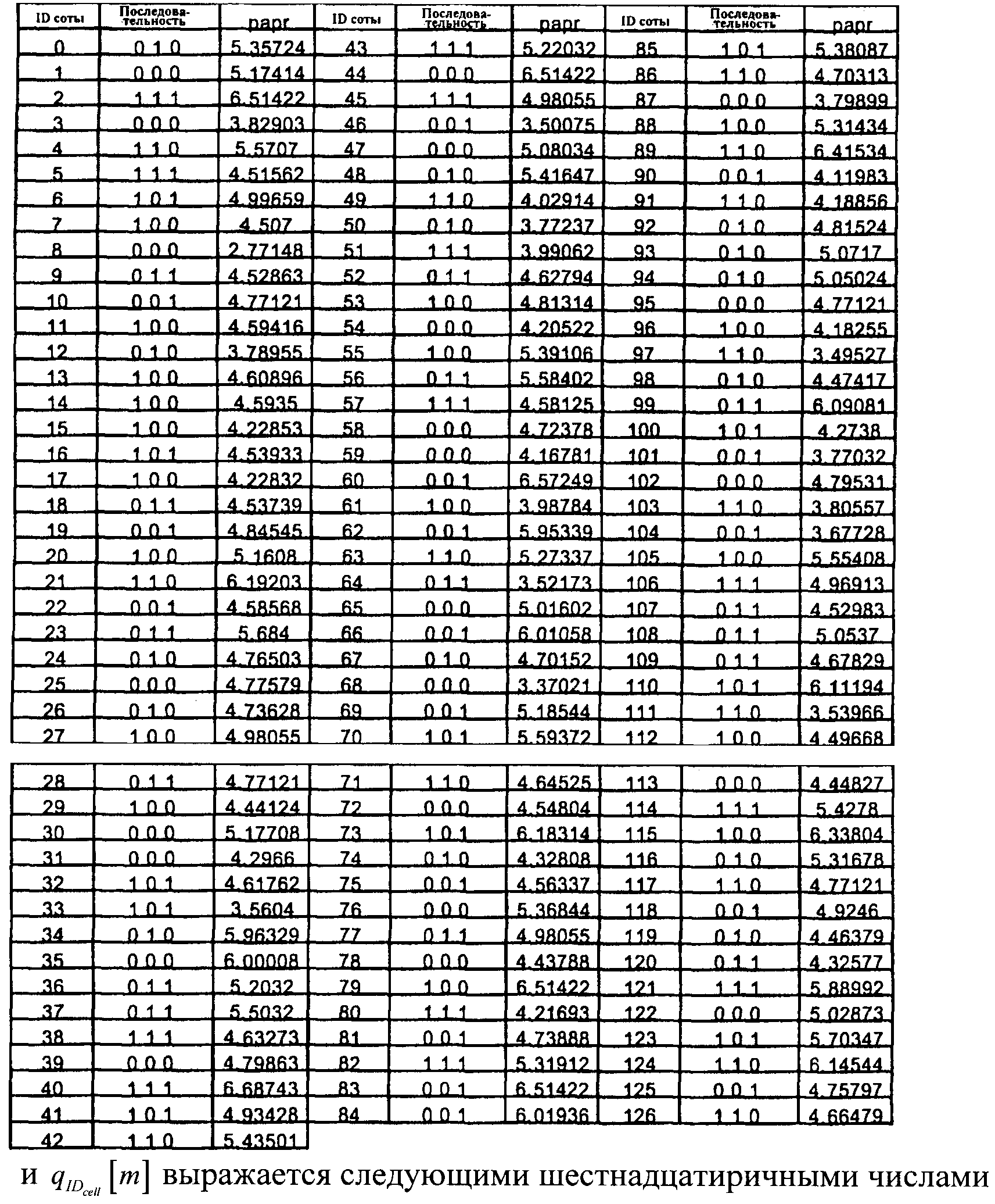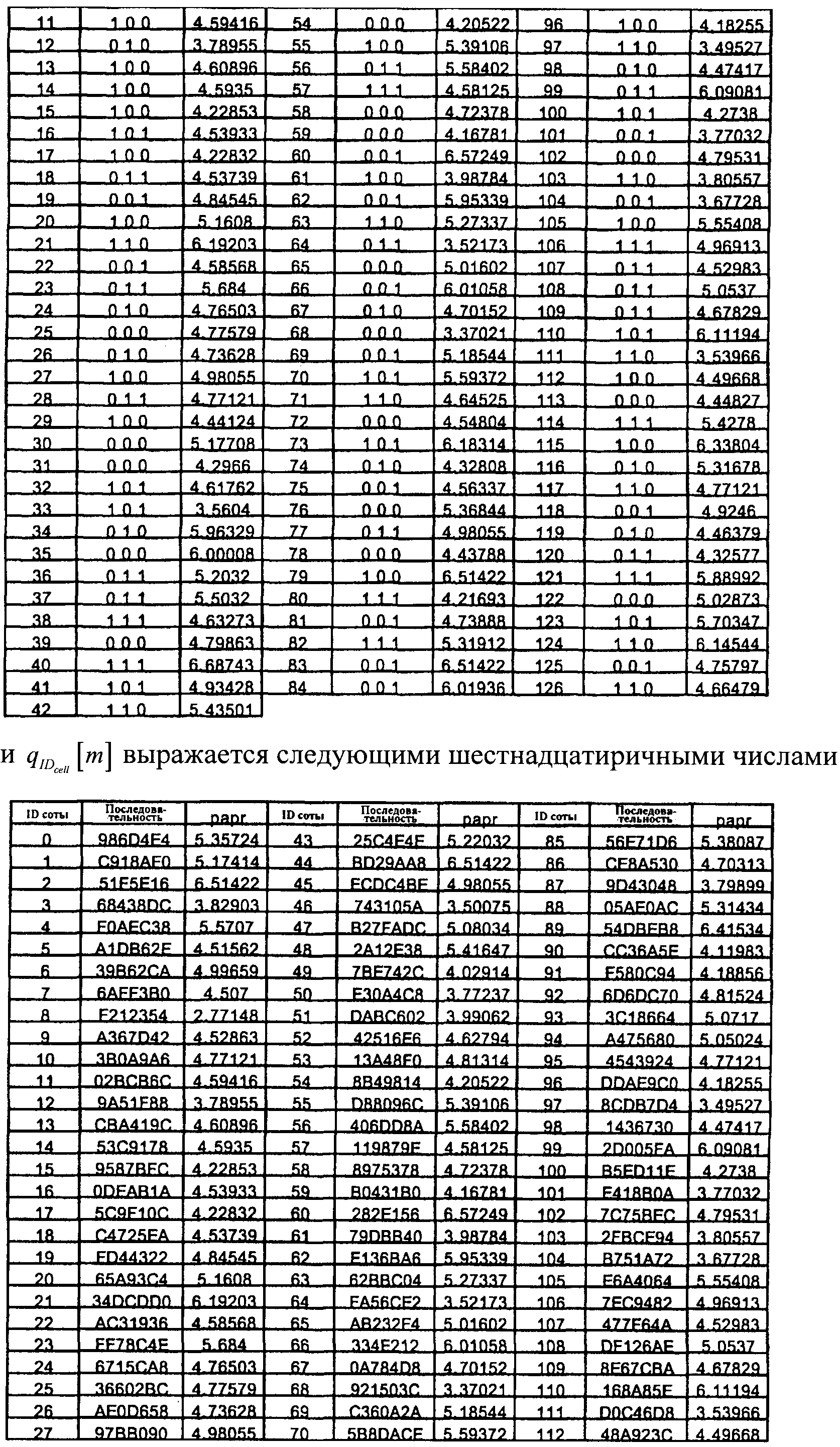 где R(r) обозначает первую последовательность, Т(-) обозначает вторую последовательность, bIDcell+1 обозначает векторы, включенные в строку матрицы, gП(r) обозначает вектор-столбец порождающей матрицы, Nused обозначает количество поднесущих в использовании, и Nt обозначает количество передающих антенн.