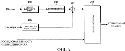 Фиг.2 является диаграммой, иллюстрирующей внутреннее строение генератора контрольного сигнала в системе связи OFDM в соответствии с вариантом осуществления настоящего изобретения. Ссылаясь на фиг.2, генератор контрольного сигнала включает в себя кодер 201 блочного кода, перемежитель 203, повторитель 205 кода Уолша, сумматор 207 и объединитель 209.