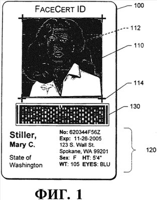 При использовании архитектуры FaceCert считываемое человеком представление включает в себя считываемую человеком распечатку портретной фотографии 110 человека и любую дополнительную информацию 120 (обычно, персональную информацию). Считываемое компьютером представление включает в себя считываемый устройством 2-мерный цветной штриховой код 130, который содержит криптографически подписанное сообщение.