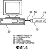 Фиг.4 визуально иллюстрирует маркер защиты согласно предпочтительному варианту осуществления изобретения. Дисплей 19 маркера 10 отображает одноразовый пароль подобно предшествующему уровню техники. Традиционным способом обеспечить одноразовый пароль является набор отображенного значения на средстве ввода хоста 20, например, вспомогательной клавиатуре. Согласно предпочтительному варианту осуществления данного изобретения вместо того, чтобы набирать пароль, пользователь вставляет соединитель 18 (например, разъем USB) в соответствующее гнездо хоста, и маркер взаимодействует с хостом через канал 30 связи (проводной или беспроводный), для того чтобы обеспечить одноразовый пароль.