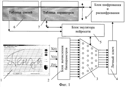 При извлечении из нейросети ключа его легальным владельцем он (пользователь) предъявляет свой биометрический образ. Пользователь воспроизводит на графическом планшете своею рукой свой рукописный пароль. Кривые колебаний пера и его давление на графический планшет оцифровываются, нормируются блоком 1 и преобразуются блоком 2 в 416 контролируемых биометрических параметра. Эмулятор нейросети (блок – 5), пользуясь незашифрованными фрагментами 1с и 1п таблиц 6 и 7, восстанавливает 32 выходных состояния первых 32 нейронов однослойной нейронной сети (1/8 часть ключа – фрагмент 1к). Далее, полученный фрагмент ключа – 1к используют для расшифрования фрагментов 2с и 2п таблиц 6 и 7.