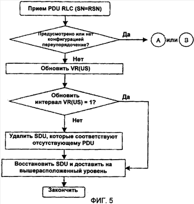 [17] Во-первых, значение следующего порядкового номера «VR(US)» обновляется (заново устанавливается) для его приведения в соответствие со значением порядкового номера «SN» принимаемого блока протокольных данных «PDU RLC». Во-вторых, если на вышеназванном первом шаге интервал обновления «VR(US)» не равен 1, считается, что, как минимум, один блок протокольных данных «RLC PDU» пропущен, и отвергаются все блоки служебных данных «RLC SDU», связанные с одним или несколькими пропущенными блоками протокольных данных «RLC PDU». В ином случае, если интервал обновления равен 1, выполняется следующий шаг. В-третьих, выполняется процедура восстановления с использованием успешно принятых блоков протокольных данных «RLC PDU», а затем только успешно восстановленные блоки служебных данных «RLC SDU» передаются на вышерасположенный уровень, и действие завершается.