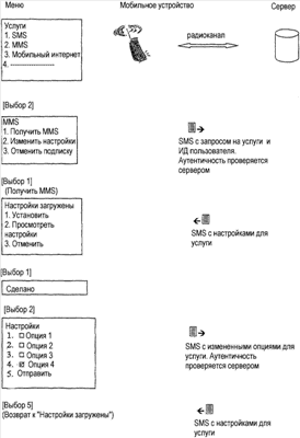 Предположим, что пользователю желательно установить услугу MMS. Путем нажатия клавиши 1 мобильное устройство начинает выполнять требуемые операции. Таким образом, соединение с сервером устанавливается путем вызова телефонного номера сервера, который предварительно загружен в мобильный телефон или на SIM-карту. Из памяти телефона выбирается подходящее SMS-сообщение, содержащее запрос на услугу MMS и идентификацию пользователя. Сервер проверяет аутентичность запроса. Если запрос принят, сервер посылает на мобильный телефон SMS-сообщение с требуемыми настройками для услуги.