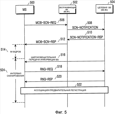 MS 500, принимающая MOB-SCN-RSP сообщение, выполняет операцию сканирования по отношению к целевым BS таким же образом, как описано со ссылкой на фиг.4. Кроме того, MS 500 может запросить доступ к целевой BS 504 с целью ассоциации в процессе выполнения операции сканирования. В этом случае, MS 500 передает сообщение запроса ранжирования (RNG-REQ) к целевой BS (этап 518). Как описано выше со ссылкой на фиг.4, целевая BS не может заранее распознать ассоциацию MS в традиционной системе связи стандарта IEEE 802.16e, так что MS передает RNG-REQ сообщение к целевой BS с помощью конкурентной схемы произвольного доступа. Однако в соответствии с настоящим изобретением целевая BS может заранее распознать операцию ассоциации для MS вследствие SCN-NOTIFICATION сообщения, переданного ей от обслуживающей BS, так что целевая BS 504 транслирует BS информацию, добавляя IE быстрого ранжирования UL для MS, выполняющей ассоциацию к BS информации, таким образом, что MS может передать RNG-REQ сообщение целевой BS с использованием неконкурентной схемы доступа для начального доступа для MS (этап 516).