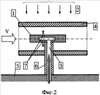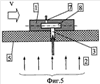 СВЧ-излучатель создает электромагнитное поле в рассматриваемой газовой среде, скорость воздуха (V) которой во внешнем потоке может изменяться от нуля до трансзвуковых значений и выше. В данную среду помещается предлагаемое устройство для инициации разряда и генерации высокотемпературной плазмы. Источник 2 СВЧ-излучения, воздействуя на металлический электромагнитный вибратор 1, вызывает протекание в нем тока. Собственное поле вибратора 1, вызванное этим током, имеет максимальное значение на его полюсах. Значение напряженности Е этого поля в локальной области вблизи полюса может значительно превышать значение исходного поля. Подбирая геометрические параметры вибратора 1 (в соответствии с рекомендациями [7]), можно добиться, чтобы значение Е превышало величину напряжения пробоя Епроб [8]. Топливо по каналу 3, подаваемое через пилон 6 и вибратор 1, распределяется внутри корпуса 4 через коллектор и отверстия, в зависимости от условий подачи топлива, 7, 8, 9, и смешивается с воздухом, захватываемым входным отверстием (воздухозаборником) корпуса. В случае, если входное отверстие корпуса 4 отсутствует, то в устройство через пилон 6 подается автономно подготовленная смесь воздуха с горючим в требуемой пропорции. При прохождении смеси через область разряда, где температура среды достигает значений Т=(2-4)×103 К, смесь дополнительно облучается ультрафиолетовым излучением разряда, возбуждается и воспламеняется. Скорость газа в канале корпуса устройства с учетом дросселирования течения при теплоподводе дозвуковая и поэтому реализуется эффективное сгорание топлива [4]. В случае размещения вибратора 1 на радиопрозрачном диэлектрике 5, фиг.5, или установки устройства на радиопрозрачной диэлектрической стенке 5, фиг.4, количество подаваемого горючего подбирается таким образом, чтобы обеспечить требуемое значение коэффициента избытка топлива и стабильное воспламенение образующейся смеси. Изменяя размеры воздухозаборника и, соответственно, расход захватываемого воздуха, и расход подаваемого горючего (фиг.2), а также изменяя схему распределения горючей смеси, можно регулировать расход высокотемпературного газа на выходе из устройства и его тепловую мощность.
