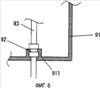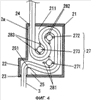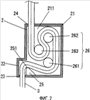 На фиг. 2 показано горизонтальное сечение устройства для удержания электрического провода согласно настоящему изобретению. На фиг. 3 показано вертикальное сечение устройства для удержания электрического провода по фиг. 2. Как показано на фиг. 2, устройство 2 для удержания электрического провода содержит кожух 21, выступ 22, выступающий из передней стороны боковины кожуха 21, отверстие 23 в передней поверхности выступа 22 для введения кабеля 3 питания, выходное отверстие 24 для вывода кабеля питания, выполненное в задней поверхности и из которого выходит кабель питания, элемент 25 для перегиба электрического провода, расположенный рядом с отверстием 23 для введения электрического провода, и три удерживающих штифта 26, вокруг которых обмотан кабель 3 питания.