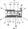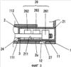 Как показано на фиг. 2, удерживающий штифт 26 содержит первый удерживающий штифт 261, расположенный на передней стороне, второй удерживающий штифт 262, расположенный на задней стороне, и третий удерживающий штифт 263, расположенный между первым удерживающим штифтом 261 и вторым удерживающим штифтом 262. Первый, второй и третий удерживающие штифты 261, 262 и 263 поднимаются от донной поверхности 211 кожуха 21 (см. фиг. 3). Первый и второй удерживающие штифты 261, 262 расположены так, что отрезок прямой между центрами первого и второго удерживающих штифтов 261 и 262 проходит параллельно направлению скольжения устройства 2 для удержания электрического провода. Третий удерживающий штифт 263 расположен несколько ближе к выходному отверстию 24 для электрического провода, чем этот отрезок прямой, соединяющий центры первого и второго удерживающих штифтов 261 и 262.