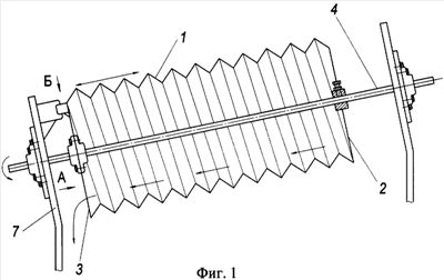 Этот технический эффект достигается тем, что барабан выполнен из эластичного материала в виде спирально-гофрированного цилиндра, закрепленного на приводном и выходном дисках, приводной диск жестко закреплен на валу, выходной диск выполнен с возможностью осевого перемещения и вращения на приводном валу и снабжен упором, взаимодействующим с фиксатором переменной длины, укрепленным на раме.