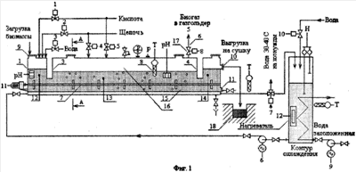 – в заявляемой установке имеется управляющий автомат, выполненный в виде микропроцессорного контроллера, который следит за созданием заданной кислотности, температуры, влажности, давления внутри биореактора, обеспечивая при этом стабильность процесса протекания биореакций. Горизонтальная трубчатая конструкция биореактора, имеющая на выходе свободный излив, обеспечивает простоту обслуживания биореактора.