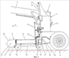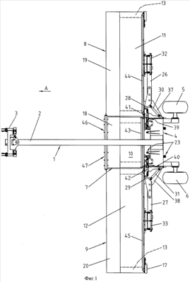 В основном, вертикальная шарнирная ось 28, 29 каждой несущей стойки 26, 27 расположена сзади соответствующего бокового устройства 8, 9 подборки и валкования и рядом с его концом, находящимся рядом с центральным устройством 7 подборки и валкования. Каждую из указанных шарнирных осей 28, 29 устанавливают в верхней и нижней стенках боковой балки 37, 38 главной рамы 1 (см. фиг.1 и 5). Гидравлические силовые цилиндры 30, 31, предназначенные для складывания несущих стоек 26, 27 вокруг шарнирных осей 28, 29, предпочтительно устанавливают в указанных боковых балках 37, 38. Одним из своих концов они шарнирно соединены с одной из стенок этой балки 37, 38 и другим концом – с соответствующей несущей стойкой 26, 27. Каждая боковая балка 37, 38 содержит практически горизонтальную поворотную ось 39, 40, ориентированную в направлении движения (А). Эта ось позволяет каждому боковому устройству 8, 9 подборки и валкования и соответствующей несущей стойке 26, 27 перемещаться по высоте, например, чтобы огибать неровности почвы. С каждой боковой балкой 37, 38 может быть связан гидравлический силовой цилиндр 41, 42, чтобы приподнимать соответствующее устройство 8, 9 подборки и валкования в случае, когда на пути возникает более высокое препятствие.