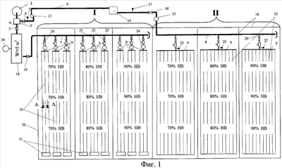 Увлажнители 10 и гибкие поливные трубопроводы 12, работая в разное время суток, исключают пиковые нагрузки на насосную станцию 2.