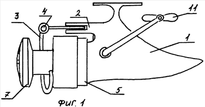 Устройство катушки Петрова состоит из корпуса 1, на который устанавливается консоль 2 с дужкой 3 и корпусом ролика лесоукладывателя 4, из ротора 5 и втулки 6, выполненной в виде двух соединенных между собой цилиндров, на один из которых надевается и закрепляется шпуля 7. Во втулке 6 сделаны вырезы 8 для направляющих подшипников 9. Втулка 6 устанавливается и закрепляется на оси 10. Катушка снабжена рукояткой 11.