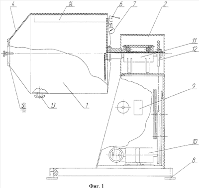 Предлагаемый электромеханический мясомассажер (фиг.1, фиг.2) содержит вращающуюся емкость 1, выполненную из диэлектрического материала. Выступы 2, изготовленные из неферромагнитного материала, являются низкопотенциальными электродами. Все 3 выступа, сдвинутые на 120° по внутреннему периметру емкости, соединены с токоподводящим кольцом 3. В свою очередь, кольцо 3 соединено с валом 4 привода емкости. Внутри вала 4 проходит токоподводящий провод 5 в изоляционной трубе 6. Этот токоподводящий провод 5 соединен с высокопотенциальным кольчужным электродом 7. Этот электрод 7 находится со стороны торцевой поверхности диэлектрической емкости 1 и соединен с генератором непрерывного импульсного тока через полый вал привода емкости. Вакуумный насос 8 расположен в основании корпуса. На емкости имеется сливной клапан 9. Емкость закрывается крышкой 10.