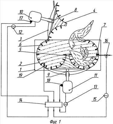 В полость, образованную диском 5 с выпуклой поверхностью и овальной камерой 2, укладывается птица. Затем крышка 3 закрывается и включается блок управления 14. Блок управления 14 с одного из выходов подает сигнал на исполнительный механизм 15, который открывает клапан 16 сопел 7 для подачи нагретого тела, например, пара в полость камеры 2, одновременно с другого выхода вышеназванного блока 14 подается сигнал на исполнительные механизмы 12 и 13 приводов 10 и 11 роторов 8 и 9, которые приводят во вращение побудительные диски 4 и 5 соответственно. В период запуска установки привода 10 и 11 вращают ротор 8 и 9 в одном направлении и активность воздействия гибких пальцев 6 на оперение птицы незначительна, идет в большей мере вращение птицы в полости, т.к. побудительные диски 4 и 5 имеют большую поверхность, чем поверхность камеры 2. Активность воздействия на оперение не должна быть высокой на начальном этапе работы установки ввиду значительного сцепления оперения с кожей птицы и только при достижении определенной температуры в полости камеры 2 за счет подачи пара через сопла 7 процесс необходимо активизировать. При достижении требуемой температуры в полости, а соответственно и на поверхности тушки птицы датчик температуры 19 подает сигнал на один из входов блока управления 14 который, при поступлении этого сигнала, вырабатывает сигнал управляющего воздействия и через исполнительный механизм 15 закрывает клапан 16, а через исполнительный механизм, например, 12 переключает на противоположное вращение привод 10. Создается противоположное вращение дисков 4 и 5 при неподвижной камере 2.