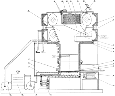 Резаный продукт по загрузочному лотку 23 поступает в сортировальное устройство, где происходит разделение на две фракции: сход и проход. Проходом являются частицы меньшего размера, несоответствующие технологическим требованиям (допускается в пределах 5…8%), а сходом – стандартные частицы. Процесс сортирования происходит при вращении барабана сортировки, скорость вращения которой подобрана таким образом, чтобы частицы находились в свободном падении (полете) внутри барабана. Это приводит к интенсификации процесса, так как увеличивается площадь воздействия вакуума на каждую отдельно взятую частицу продукта, а следовательно, уменьшается и вероятность слипания частиц между собой, что приводит к уменьшению времени обработки в вакууме на стадии самозамораживания. Нестандартные частицы по лотку 21, расположенному снизу барабана, направляются к окну выгрузки льда и некондиционной фракции. Лед и нестандартные частицы отводятся конвейером карусельного типа 4, который движется по роликам 5 и приводится в движение электроприводом 10 через ременную передачу 16. Прилипший лед с конвейера снимается декой 3 и удаляется через вакуумный затвор 6 в бункер-плавитель 9. Резаный сортированный продукт через собирающую воронку 18 падает в сушильную камеру, где сушится под воздействием СВЧ- и УЗИ-полей. На стадии удаления остаточной влаги в нижнюю часть сушилки подается сушильный агент (инертный газ, воздух) через термостат 13 насосом 12 в рассеиватель 8.