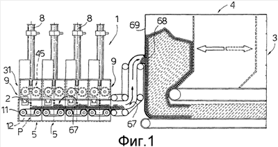 При использовании ряда модулей 5, расположенных бок о бок, как в примере на фиг.1, конвейеры 28 модулей 5 расположены вблизи друг друга и действуют последовательно, образуя подвижную нижнюю стенку входной части транспортного канала 67, который соединен с внутренним пространством накопителя 3 через отверстие 68, образованное в боковой стенке 69 накопителя 3, и служит для подачи множества отдельных частей 2 фильтров по направлению 7 в накопитель 3.
