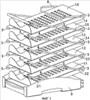 Фиг.1 изображает вид в изометрии варианта осуществления комплекта полок в соответствии с изобретением в положении хранения.