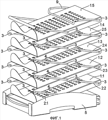 Самый нижний конец самого нижнего стержня 2.1 располагается в основании 5. В этом случае местоположение самого нижнего конца самого нижнего стержня 2.1 зафиксировано, но стержень 2.1 может поворачиваться вокруг зафиксированного положения в основании 5. Самый нижний конец самой нижней полки 1.1 также прикреплен к основанию 5 на расстоянии от самого нижнего стержня 2.1. Самая нижняя полка 1.1 также может поворачиваться относительно основания 5, но в отличие от самого нижнего стержня 2.1, она устанавливается с возможностью скольжения в основании 5. Таким образом, для перемещения комплекта полок из положения хранения в демонстрационное положение самый нижний конец самой нижней полки 1.1 может скользить по направлению к положению самого нижнего конца самого нижнего стержня 2.1. По мере приближения самых нижних концов самой нижней полки к стержню и полка 1.1, и стержень 2.1 будут поворачиваться, перемещая полку 1.1 в более вертикальное положение. Это приводит к одновременному повороту всех полок 1 и стержней 2 устройства. Когда самый нижний конец самой нижней полки находится на расстоянии от самого нижнего конца самого нижнего стержня, что соответствует нахождению комплекта полок в демонстрационном положении, он может быть заблокирован в этом положении с помощью блокировочного средства, такого как затвор. Таким образом, комплект полок может быть заблокирован в демонстрационном положении. Для возвращения в положение хранения блокировочное устройство расцепляют, и самый нижний конец самой нижней полки 1.1 скользит от самого нижнего стержня 2.1.