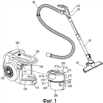 Как показано на фиг.1, пылесос содержит основной корпус 100, вмещающий генератор всасывающей силы для создания вакуумного давления в пылесосе, и пылесборное устройство 200 для отделения загрязняющих частиц, содержащихся в воздухе, и их хранения.