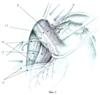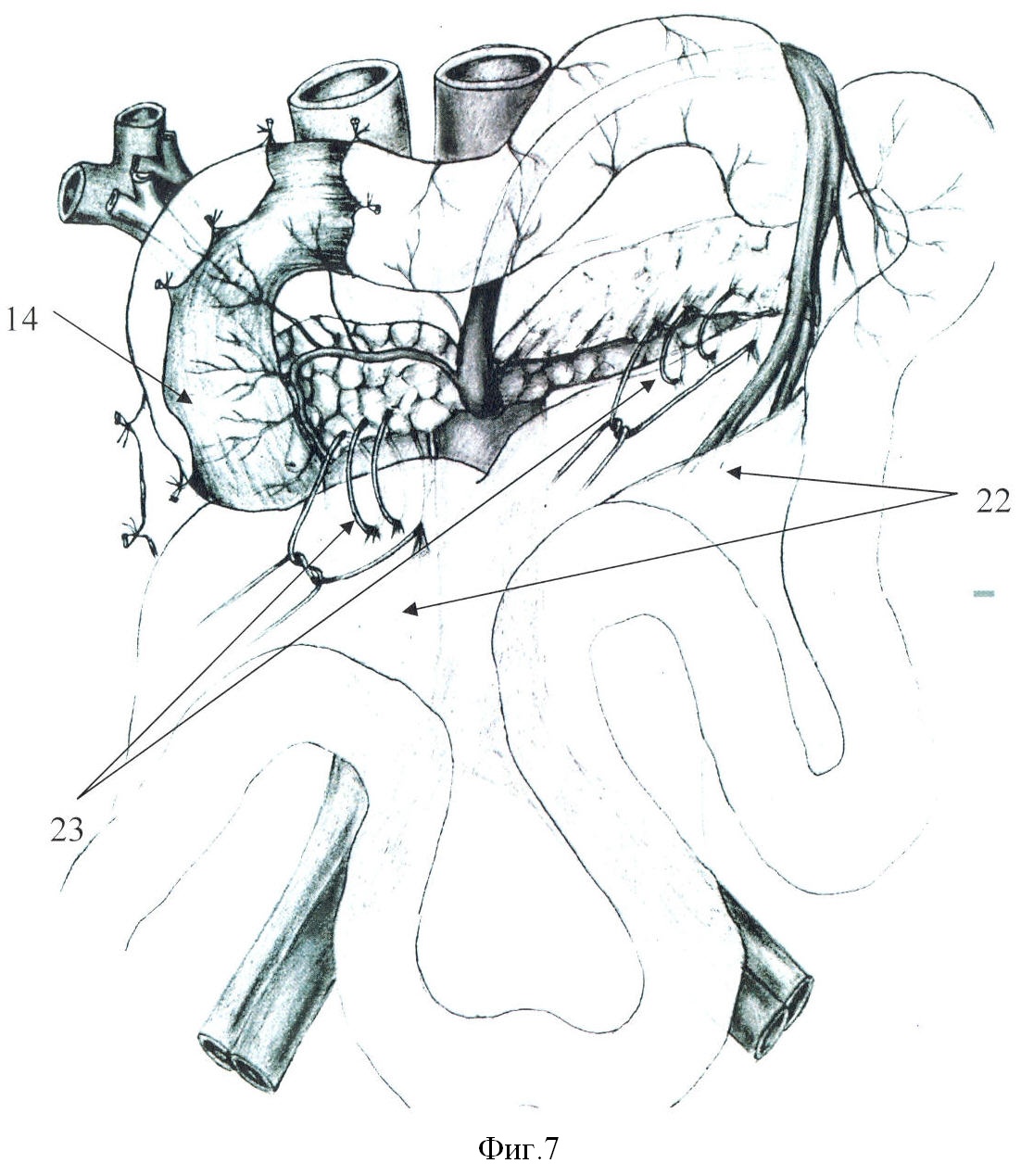 1 – грыжа пищеводного отверстия диафрагмы; 2 – увеличенный и опущенный желудок; 3 – расширенная вследствие хронической дуоденальной непроходимости ДПК; 4 – опущенная правая половина толстой кишки; 5 – второй тип строения толстой кишки (острые печеночный и селезеночный изгибы); 6 – трансверзоптоз; 7 – долихосигма; 8 – низведенный абдоминальный отдел пищевода; 9 – шов-связка, формирующая острый угол Гиса; 10 – шов-связка, сочетающаяся с задней крурорафией; 11 – основной ствол переднего блуждающего нерва; 12 – задний ствол блуждающего нерва; 13 – печеночные ветви блуждающего нерва; 14 – нисходящая ветвь ДПК; 15 – головка поджелудочной железы; 16 – сохраненная брыжейка левой половины толстой кишки; 17 – проксимальная граница резекции; 18 – дистальная граница резекции; 19 – направление ротации при транспозиции; 20 – илеоцекальный переход; 21 – фиксирующий илеоцекальный переход шов-связка; 22 – брыжейка тонкой кишки; 23 – швы-связки, фиксирующие корень брыжейки тонкой кишки.