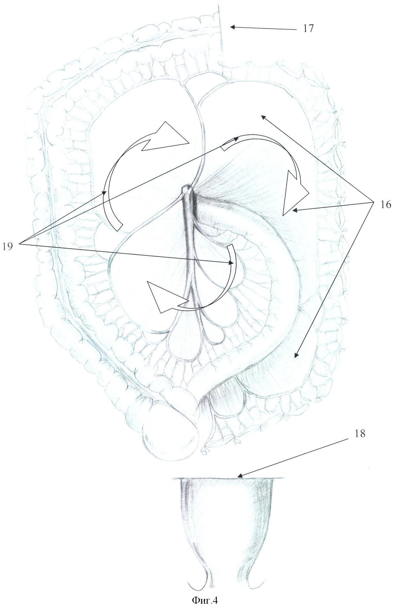 3) фиксация кишки в новом дренажном положении позволяет избежать патологической фиксации ее в послеоперационном периоде, а также ускорить пассаж толстокишечного содержимого;