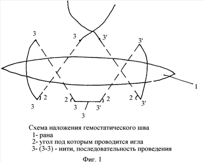 Изобретение относится к медицине, а именно к хирургии, и может быть использовано при операциях на печени, селезенке. Известные способы наложения гемостатических швов, применяемые в хирургии паренхиматозных органов: узловые (Дибижев В.В., 1959, Собстель М.М. 1953), матрацные (Sherman N.J. 1979), П-образные (Орлянская В.Т., 1981, Горюнов В.Т., и др. 1990), 8-образные (Телков Н.А., 1963 Кузнецова-Пенского, Варламова, Брегадзе, Marel 1932, Campos Christo, 1963, Lynn H.B. 1979 и другие) не всегда удовлетворяют практических хирургов, так как технически многие трудновыполнимы, не обеспечивают гемостаз, травматичны, часто прорезываются, удлиняют время операции.