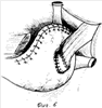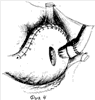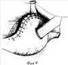 Производят верхнесрединную лапаротомию. Мобилизуют абдоминальный отдел пищевода и желудка по малой и большой кривизне. Мышечный слой пищевода в абдоминальном отделе рассекают циркулярно до подслизистого слоя и заворачивают вверх, охватывая пищевод с фиксацией верхнего края отдельными швами, тем самым создавая мышечный жом (1). Слизисто-подслизистый слой пищевода отсекают от желудка и берут на две держалки. Выполняют проксимальную резекцию желудка либо гастрэктомию по стандартной методике. Приступают к формированию пищеводно-желудочного, пищеводно-кишечного анастомоза. Формируют заднюю губу анастомоза. Производят наложение первого ряда швов. Задние полуокружности пищевода и культи желудка (кишки) сшивают 3-4 узловыми швами (2). Для этого на пищеводе в шов берется мышечная оболочка выше сформированной манжеты на 0,5 см, на желудке накладывают серозно-мышечный шов на передней стенке желудка (кишки). Края сформированной задней полуокружности берут на две держалки. Отступя от края шва на 1 см на передней стенке желудка (кишки), рассекают серозно-мышечный слой на ширину пищевода для формирования соустья и проводят электрокоогуляцию сосудов подслизистого слоя в этой области. Формируют второй ряд швов (3). Для этого слизисто-подслизистый слой пищевода за держалки отводят к верху. На пищеводе в шов берется мышечная дубликатура нижней задней части сформированной манжеты, на желудке накладывают серозно-мышечный шов по краю рассеченной стенки в области верхнего угла анастомоза. Лигатура берется на держалку. Накладывают непрерывный шов рассасывающей нитью, формируя заднюю стенку до нижнего угла анастомоза. Лигатура берется на держалку. Производят электрокоогуляцию и рассечение слизисто-подслизистого слоя в области анастомоза на передней стенке желудка (кишки). Края раны разводят и погружают свободный участок слизисто-подслизистой пищевода, предварительно связав данный участок рассасывающей нитью, через сформированное отверстие в просвет желудка (кишки) (4). Формируют переднюю губу путем продолжения наложения первого ряда пищеводно-желудочного непрерывного шва, начиная от нижнего угла в направлении верхнего (5). На пищеводе в шов берется нижний край передней части манжеты, на желудке (кишке) – серозно-мышечный слой по краю анастомоза. Держалку срезают. Переднюю полуокружность пищевода и культи желудка (кишки) сшивают 3-4 узловыми швами, формируя второй ряд швов (6). Для этого на пищеводе в шов берется мышечная оболочка выше сформированной манжеты на 0,5 см, на желудке накладывают серозно-мышечный шов на передней стенке желудка (кишки), отступая от первого ряда швов на 2-3 см. Держалки срезают (7).