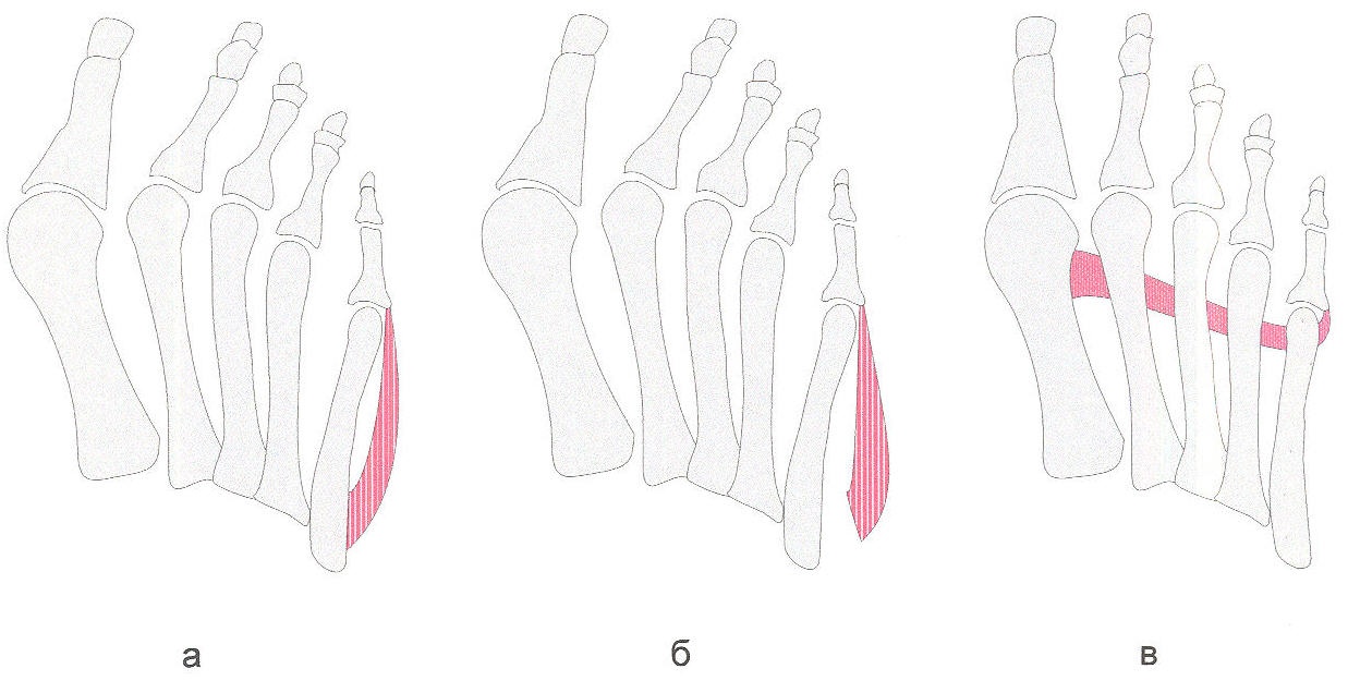 Предлагаемый способ оперативного лечения деформации переднего отдела стопы заключается в следующем. Линейным разрезом кожи на тыле стопы осуществляется доступ к I межплюсневому промежутку, от основной фаланги I пальца отсекается сухожилие мышцы, приводящей первый палец стопы. Отсеченное сухожилие с участками подошвенного апоневроза и участком глубокой подошвенной фасции стопы прошивается лавсановой нитью и фиксируется к I плюсневой кости через сформированный поперечный канал. Из дугообразного разреза по внутренней поверхности стопы в области I плюснефалангового сустава производится удаление костно-хрящевого экзостоза I плюсневой кости, пересечение сухожилия мышцы, отводящей первый палец и фиксация I пальца в положении коррекции путем натяжения капсулы сустава. При наличии молоткообразной деформации II-III пальцев производится ее устранение известными способами. Для уменьшения поперечного плоскостопия и устранения варусной деформации V пальца дополнительно из двух разрезов на наружной поверхности стопы осуществляется доступ к бугристости V плюсневой кости и V плюснефаланговому суставу, визуализируются дистальный и проксимальный участки мышцы, отводящей V палец, осуществляют отсечение мышцы, отводящей V палец, от бугристости V плюсневой кости. Конец мышцы прошивается лавсановой нитью, через сформированный канал под II-V плюсневыми костями выводится в I межплюсневый промежуток и фиксируется к I плюсневой кости с формированием поперечной стяжки переднего отдела стопы.