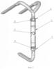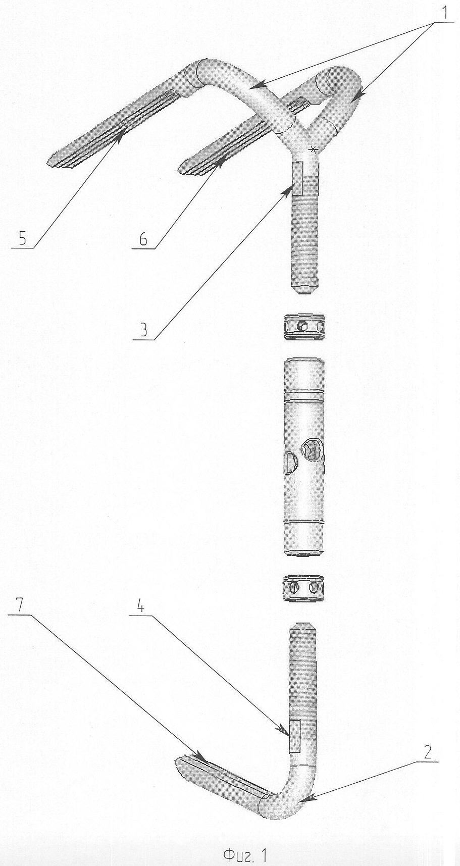 2. Устройство для осуществления способа лечения переломов хирургической шейки плечевой кости, включающее стягивающую втулку с внутренней резьбой, фиксирующий элемент для проксимального отдела, выполненный в виде рогатки под углом 85-90° с загнутыми в виде крючков и удлиненными концами полуцилиндрической формы, в месте соединения которых рогатка переходит в стержень цилиндрической формы, который имеет резьбу, фиксирующий элемент для дистального отдела, выполненный в виде крючка с удлиненным концом полуцилиндрической формы, другой конец которого выполнен в виде стержня цилиндрической формы с резьбой, стержни с резьбой имеют одинаковые диаметр и длину резьбовой части и на конце резьбы площадки под фиксирующий ключ, все крючки фиксирующих элементов изогнуты под углом 70-75°, плоская часть всех крючков доходит до изгибов крючков и имеет на своей поверхности продольные рифления, цилиндрические стержни с резьбой имеют на концах цилиндрические контргайки с отверстиями под ключ и соединены стягивающей втулкой с внутренней резьбой, причем втулка имеет несколько отверстий для ее закручивания.