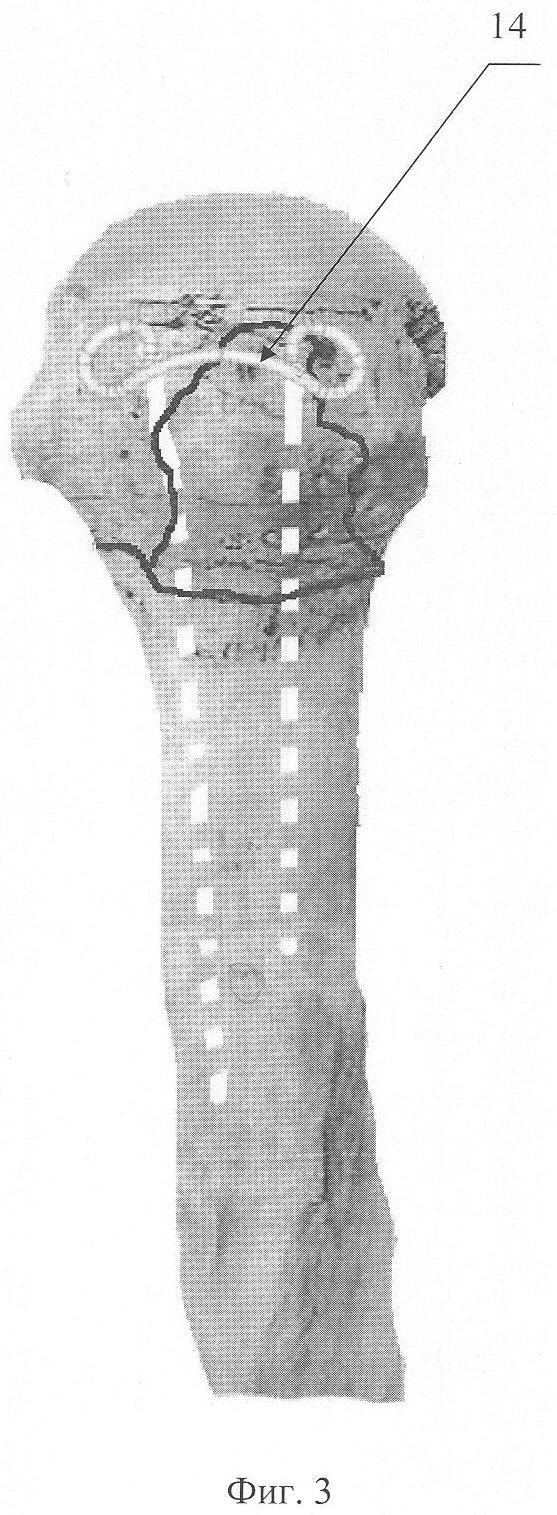 на фиг.3 изображена фиксация отломков двубраншевой спицей при переломе хирургической шейки плечевой кости;
