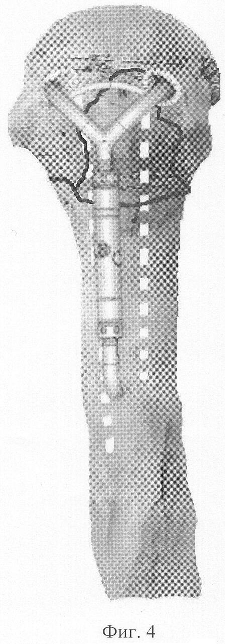 на фиг.4 показан остеосинтез перелома хирургической шейки плечевой кости с помощью фиксирующего элемента.