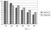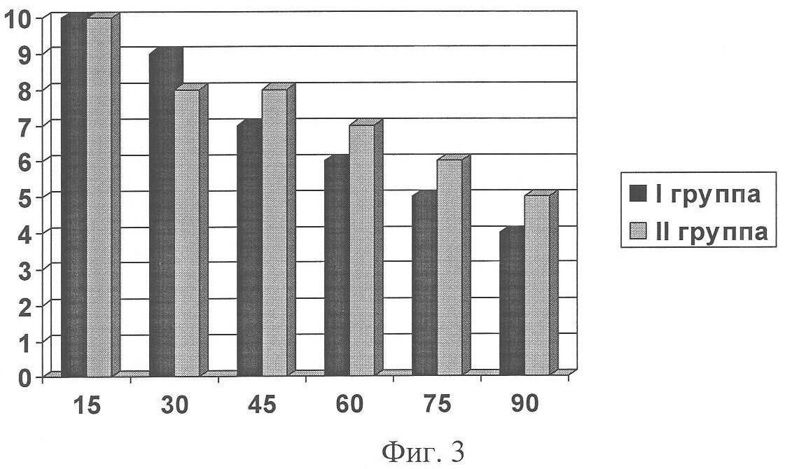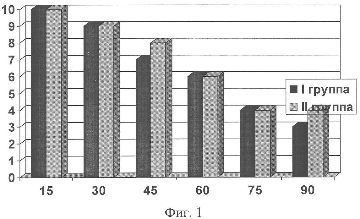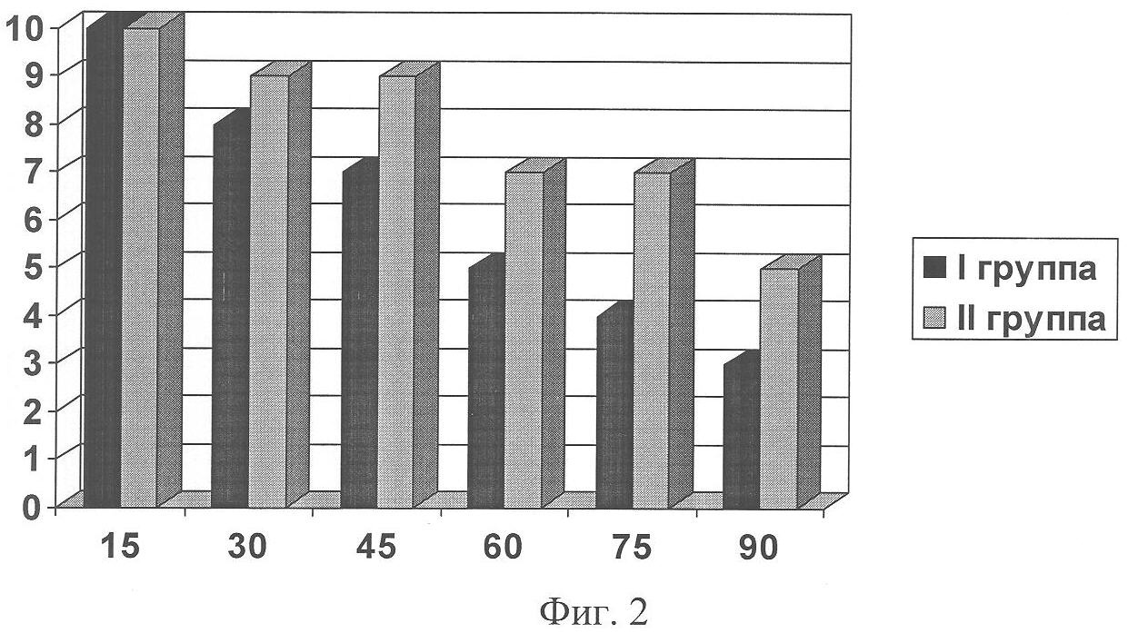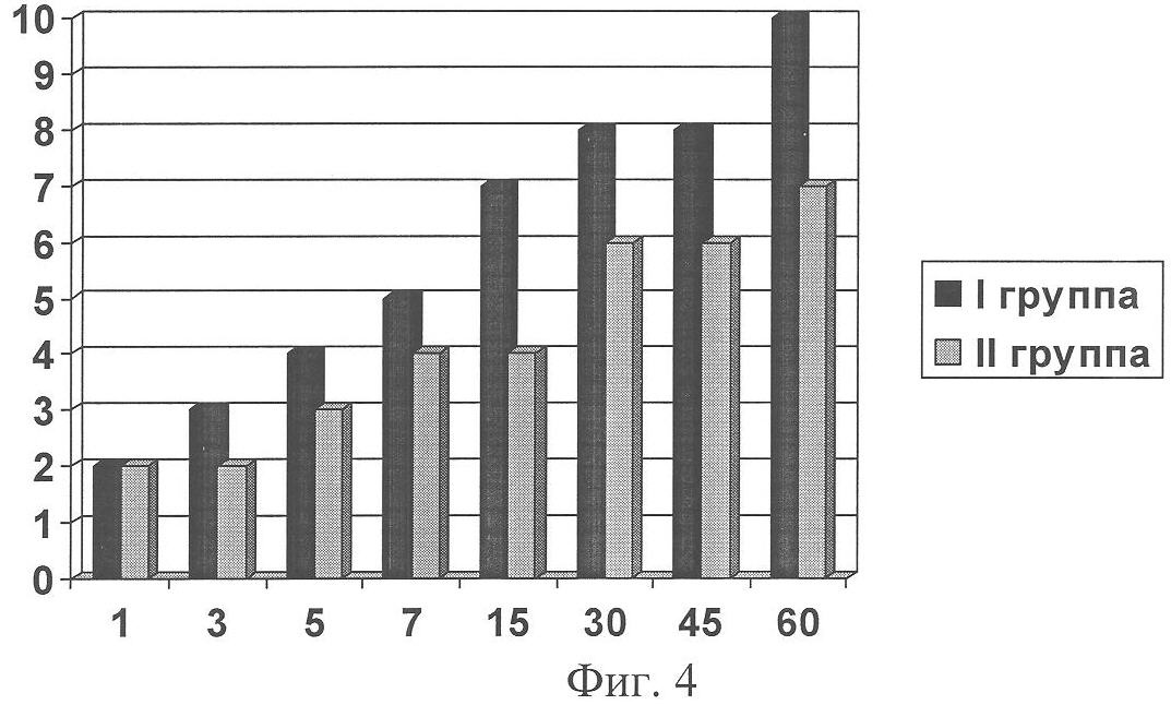 Через 6 дней после введения спиц Киршнера у 1 и 2 групп пациентов проводилась оценка лечебного воздействия. Были исследованы следующие показатели: боль в суставах в покое, при движении, местная припухлость периартикулярных тканей, увеличение подвижности суставов. Каждый показатель был оценен по 10-балльной шкале, при этом «0» баллам соответствовала его минимальная выраженность, «10» баллам – максимальная. Динамика показателей в процессе лечения показана на фигурах 1, 2, 3, 4. На представленных графиках по оси Х отложена продолжительность лечения (количество процедур), по оси Y – выраженность показателя в баллах. На фигуре 1 показана динамика выраженности болевого синдрома в покое, на фигуре 2 – при активных движениях. На фигуре 3 представлено изменение местной припухлости периартикулярных тканей в процессе лечения. На фигуре 4 отражен процесс улучшения подвижности в пораженных суставах.