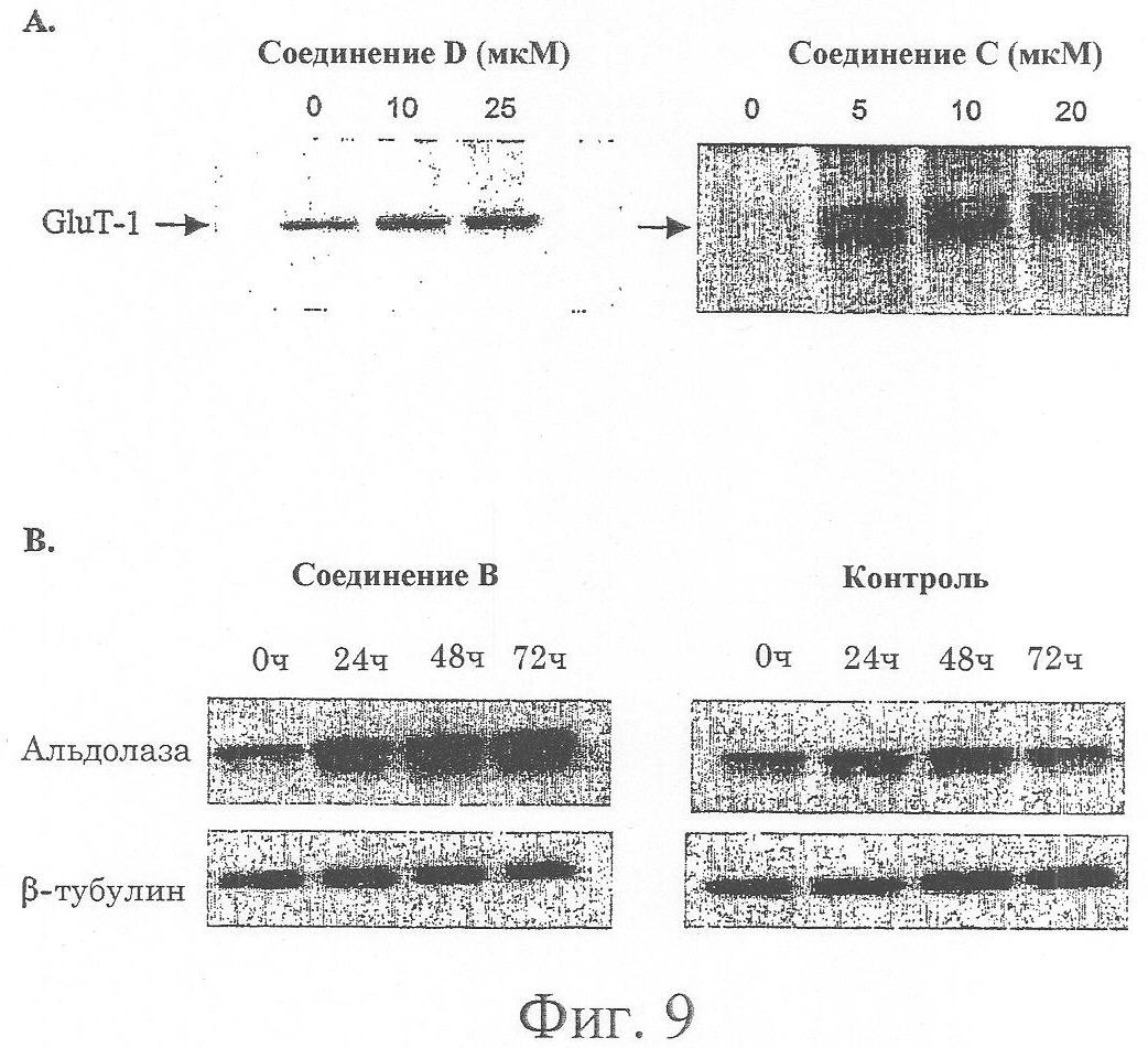 На Фигурах 9А и 9В показано индуцирование транспортера-1 глюкозы (GluT-1) и альдолазы в клетках, обработанных соединениями изобретения.