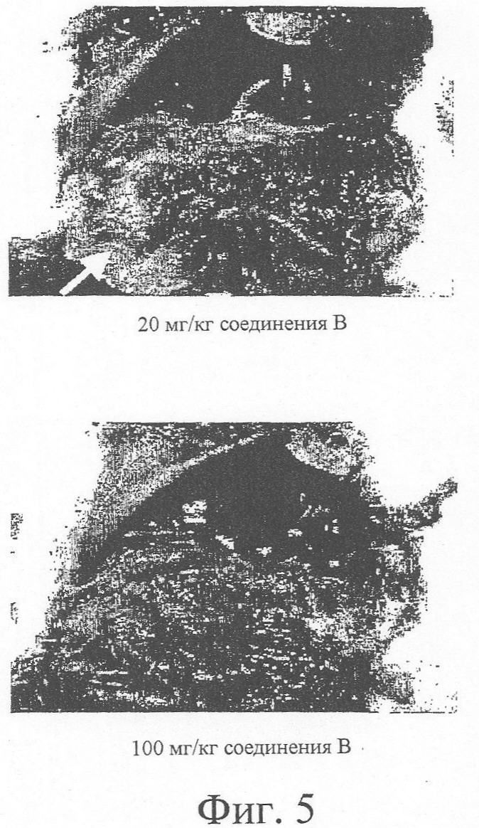 Так как абсолютный вес органа уменьшался незначительно, не наблюдалось процесса общего замедления роста у животных, подвергавшихся лечению; однако, так как относительный вес органа значительно увеличивался, наблюдалась селективная потеря другой ткани. Как показано на Фиг.5, у животных, которых подвергали лечению соединением изобретения, проявлялось зависимое от дозы уменьшение висцерального (абдоминального) жира. Стрелкой на верхнем чертеже показано присутствие висцеральной жировой ткани у животных, подвергавшихся лечению низкими дозами соединения изобретения, тогда как на нижнем чертеже показано полное отсутствие жировой ткани у животных, подвергавшихся лечению более высокими дозами соединения изобретения.