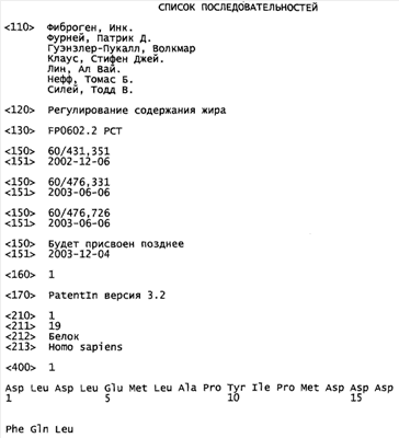 Термины “регулирование содержания жира” и “регулирование метаболизма жира”, как они использованы здесь, относятся к процессам, посредством которых клетка, ткань, орган, система органов или организм в целом достигают и/или поддерживают гомеостаз жира путем изменения, например, усиления или ослабления специфических процессов метаболизма жира. Метаболизм жира охватывают процессы, посредством которых синтезируются, транспортируются, поглощаются, процессируются, утилизируются или накапливаются жиры, такие как триглицериды, жирные кислоты, холестерин, липиды и фосфолипиды. Специфические аспекты метаболизма и регулирования содержания жира включают экспрессию липопротеинов или ферментов, которые облегчают транспорт и перемещение жира в крови и сохранение или секрецию жира клеткой; изменение экспрессии и/или активности ферментов, вовлеченных в утилизацию или образование жира, включающих, например, липолитические и липогененные ферменты, такие как ацилтрансферазы, оксидазы, липоксигеназы и т.д.; и изменение распределения жира в пределах организма, например, в окружающих тканях, жировой ткани и т.д.; или в пределах культуральных жидкостей, включающих, например, внутритканевые (т.е. внеклеточные) и внутриклеточные текучие среды, кровь, мочу и им подобные текучие среды.
