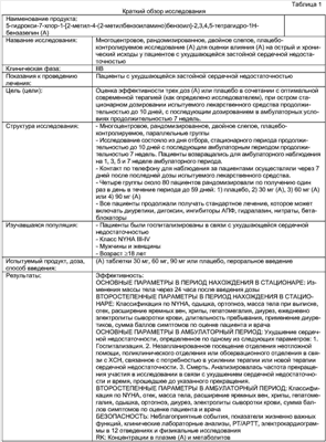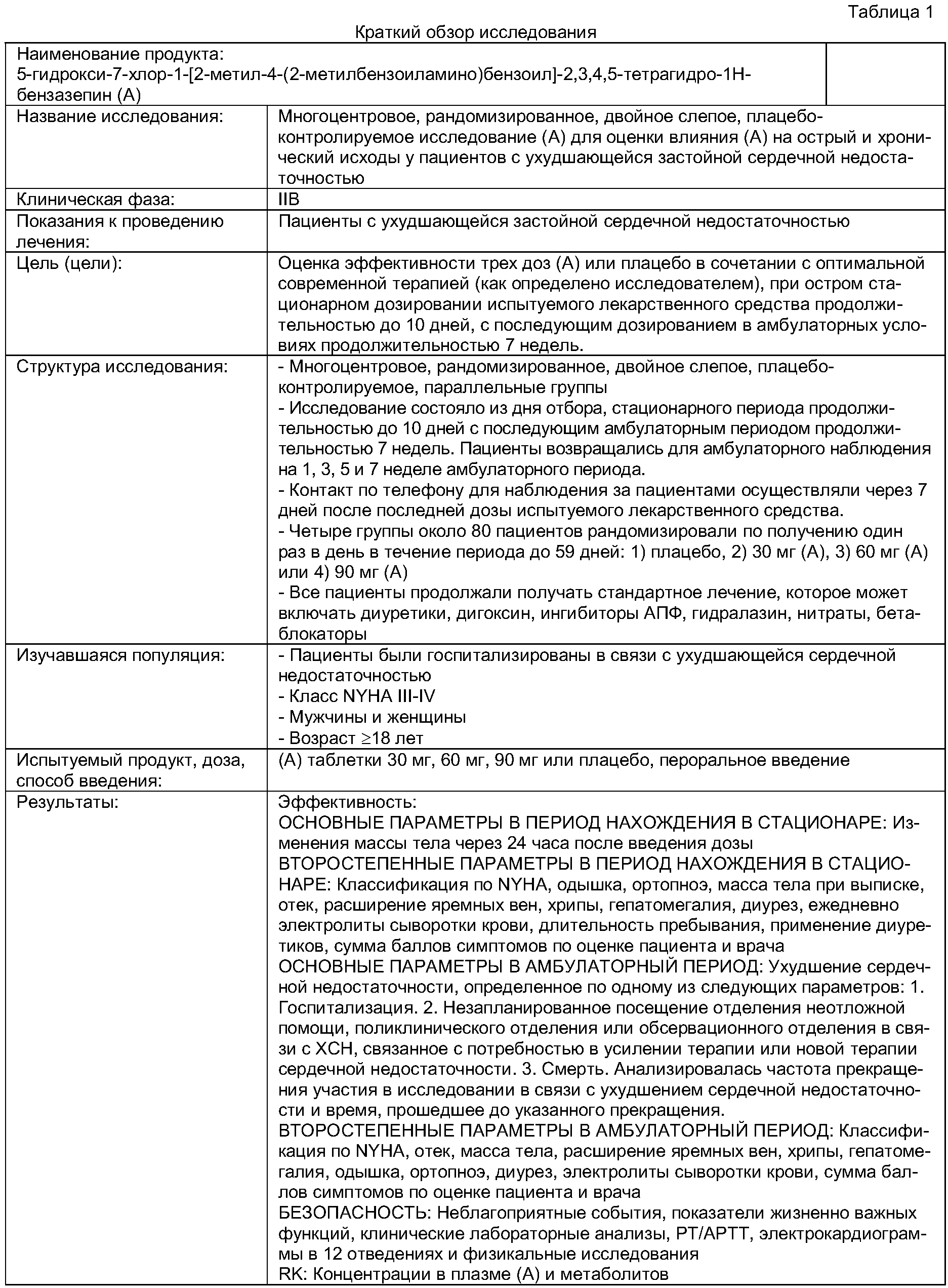 Указанные выше парабены, метабисульфит натрия и хлорид натрия растворяют в дистиллированной воде приблизительно в половинном объеме от указанного выше при перемешивании при 80°С. Полученный таким образом раствор охлаждают до 40°С, и активное соединение по настоящему изобретению, а также полиэтиленгликоль и моноолеат полиоксиэтиленсорбитана растворяют в полученном выше растворе. К раствору добавляют дистиллированную воду для инъекций до получения желаемого объема, и раствор стерилизуют фильтрованием через подходящую фильтровальную бумагу с получением препарата для инъекций. Эксперименты (1) Методы: Пациентам с тяжелой сердечной недостаточностью (т.е. пациент с острой сердечной недостаточностью или хронической сердечной недостаточностью в состоянии обострения, классы (степени тяжести) III и IV по классификации Нью-Йоркской Кардиологической Ассоциации) вводили 5-гидрокси-7-хлор-1-[2-метил-4-(2-метилбензоиламино)бензоил]-2,3,4,5-тетрагидро-1Н-бензазепин в дозе 30, 60 или 90 мг в день в течение периода времени 60 дней, который начинался от продолжительности госпитализации и после выписки из клиники (подробности представлены в таблице 1). (2) Результаты: Результаты представлены в таблицах с 2 по 7. Что касается статистического анализа, данные в таблице 2 анализировали с помощью методики ANOVA, данные в таблицах 3 и 5 анализировали с помощью методики ANCOVA, данные в таблице 5 анализировали с помощью логарифмического рангового критерия (Log-Rank test). Когда дозировки в данном эксперименте переводили в суточную дозу на 1 кг массы тела, они составляли 0,371±0,096 мг/кг (n=77) в группе, получавшей 30 мг, 0,769±0,205 мг/кг (n=83) в группе, получавшей 60 мг, и 1,149±0,283 мг/кг (n=76) в группе, получавшей 90 мг (все представляют собой среднюю величину ±СО). Как видно из результатов, в группе, получавшей 30 мг, диурез увеличивался (таблица 2), а масса тела уменьшалась (таблица 3). Кроме того, у пациентов с исходной гипонатриемией (у пациентов с концентрацией сывороточного натрия ниже нормы (менее 136 мэкв/л)) наблюдалось повышение концентрации сывороточного натрия (таблица 4). В том же эксперименте коэффициент смертности за весь период, начиная с периода госпитализации до окончания медикаментозного лечения в амбулаторных условиях, был значимо ниже в группе, получавшей 30 мг, по сравнению с контрольной группой, который анализировали, принимая во внимание время в днях от начала медикаментозного лечения до смерти пациента (Log-Rank критерий) (таблица 5). Помимо этого, в группе, получавшей самую низкую дозу 30 мг, частота мочеиспускания как неблагоприятное событие была ниже (таблица 6), а частота прекращения лечения из-за неблагоприятных событий была ниже (таблица 7) по сравнению с группами, получавшими более высокие дозы. В результате очевидно, что соединение по настоящему изобретению показывает превосходные терапевтические эффекты при тяжелой сердечной недостаточности, при контроле его дозы менее чем 0,6 мг на кг массы тела в день.