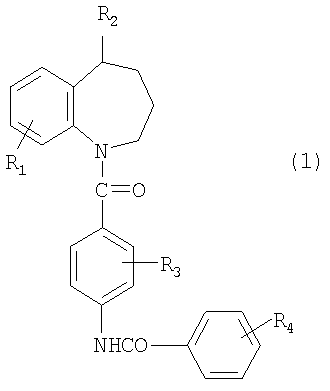 где R1 представляет собой атом водорода или атом галогена, R2 представляет собой гидроксильную группу или группу формулы -NR5R6, где R5 и R6 одинаковы или отличаются друг от друга и каждый представляет собой атом водорода или низшую алкильную группу, R3 представляет собой атом водорода, атом галогена, низшую алкильную группу или низшую алкоксильную группу, R4 представляет собой атом галогена, низшую алкильную группу или низшую алкоксильную группу; или его фармацевтически приемлемой соли. [2] В другом варианте осуществления настоящее изобретение относится к способу лечения тяжелой сердечной недостаточности, согласно указанному выше абзацу [1], в котором активное соединение (1) вводят в дозе менее чем 0,6 мг/кг в день. [3] В другом варианте осуществления настоящее изобретение относится к способу лечения тяжелой сердечной недостаточности, согласно указанному выше абзацу [1], в котором активное соединение (1) вводят в дозе от 0,1 мг/кг в день до менее чем 0,6 мг/кг в день. [4] В другом варианте осуществления настоящее изобретение относится к способу лечения тяжелой сердечной недостаточности, согласно указанному выше абзацу [1], в котором активное соединение (1) вводят в дозе от 15 мг до 45 мг на пациента в день. [5] В другом варианте осуществления настоящее изобретение относится к способу лечения тяжелой сердечной недостаточности, согласно указанному выше абзацу [1], в котором активное соединение (1) представляет собой 5-диметиламино-1-[4-(2-метилбензоиламино)бензоил]-2,3,4,5-тетрагидро-1Н-бензазепин. [6] В другом варианте осуществления настоящее изобретение относится к способу лечения тяжелой сердечной недостаточности, согласно указанному выше абзацу [1], в котором активное соединение (1) представляет собой 5-гидрокси-7-хлор-1-[2-метил-4-(2-метилбензоиламино)бензоил]-2,3,4,5-тетрагидро-1Н-бензазепин. [7] В другом варианте осуществления настоящее изобретение относится к способу лечения тяжелой сердечной недостаточности, согласно указанному выше абзацу [1], в котором тяжелая сердечная недостаточность представляет собой острую сердечную недостаточность или хроническую сердечную недостаточность в состоянии обострения. [8] В другом варианте осуществления настоящее изобретение относится к способу лечения тяжелой сердечной недостаточности, согласно указанному выше абзацу [1], в котором тяжелая сердечная недостаточность представляет собой тяжелую сердечную недостаточность по классификации Нью-Йоркской Кардиологической Ассоциации III и IV степени тяжести. [9] В другом варианте осуществления настоящее изобретение относится к новому лекарственному средству для лечения тяжелой сердечной недостаточности, которое включает в качестве активного ингредиента бензазепиновое соединение формулы (1) или его фармацевтически приемлемую соль. [10] В другом варианте осуществления настоящее изобретение относится к лекарственному средству, согласно указанному выше абзацу [9], в котором активное соединение (1) представляет собой 5-диметиламино-1-[4-(2-метилбензоиламино)бензоил]-2,3,4,5-тетрагидро-1Н-бензазепин. [11] В другом варианте осуществления настоящее изобретение относится к лекарственному средству, согласно указанному выше абзацу [9], в котором активное соединение (1) представляет собой 5-гидрокси-7-хлор-1-[2-метил-4-(2-метилбензоиламино)бензоил]-2,3,4,5-тетрагидро-1Н-бензазепин. [12] В другом вар