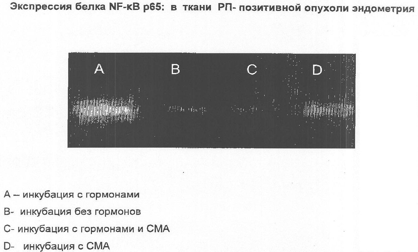 Надосадки были растворены в буфере, содержащем -меркаптоэтанол. Белки надосадка были разделены с помощью СДС – ПАГЭ – электрофореза. В каждую лунку загружалось 20 мкг белка. Для анализа путем иммуноблоттинга белки были перенесены на нитроцеллюлозную мембрану (Hybond-C, Amersham) и мембрана была инкубирована с антителами к NF-кВ р65 (Stressgen). Полосы белков были выявлены с помощью хемолюминесцентной системы. Результаты иммуноблоттинга представлены на чертеже. Из представленных на чертеже данных видно, что СМА вызывала подавление экспрессии белка NF-кВ р65 в рецептор-позитивной опухоли. Таким образом, в присутствии гормонов, стимулирующих рост опухоли эндометрия, СМА вызывает подавление белка NF – кВ в РП-позитивных опухолях.
