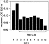 В эксперименте с пиоцианином, сходном с экспериментом, описанным в примере 10, разнообразные ПЭГ HMW проверяли в отношении их защитных свойств. Кроме того, исследовали влияние рН на продукцию индуцированного пиоцианина. Уровни пиоцианина измеряли путем определения оптической плотности при 520 нм. Результаты представлены в виде гистограммы, показанной на фигуре 8. Для Р.aeruginosa, культивируемых в триптическом соевом бульоне (TSB), рН 7,4, но не обработанных индуктором пиоцианина или каким-либо ПЭГ, продукция пиоцианина составляла приблизительно 0,14 единиц A520 (фиг.8, полоса 1). Для P.aeruginosa, культивируемых в TSB, рН 7,4 и обработанных 200 мкМ U-50488, но без ПЭГ, наблюдалась величина единиц А520 0,18 (фиг.8, полоса 2). Для Р.aeruginosa, растущих в TSB при рН 8,0 и обработанных ПЭГ HMW HM20-78-5, выход составлял 0,08 единиц А520 (фиг.8, полоса 3), тогда как Р.aeruginosa, растущие в TSB при рН 7,4 и обработанные ПЭГ HMW HM20-78-5, давали 0,09 единиц A520 (фиг.8, полоса 4). Р.aeruginosa, растущие в TSB при рН 7,9 и обработанные ПЭГ HMW DQ24-151, давали 0,08 единиц A520 (фиг.8, полоса 5), тогда как Р.aeruginosa, растущие в TSB при рН 7,4 и обработанные ПЭГ HMW DQ24-151, давали выход 0,085 единиц A520 (фиг.8, полоса 6). Для Р.aeruginosa, культивируемых в TSB, рН 8,5, и обработанных ПЭГ HMW HM20-78-6, выявляли 0,10 единиц А520 (фиг.8, полоса 7), тогда как для Р.aeruginosa в TSB, рН 7,4, и обработанных ПЭГ HMW HM20-78-6, выход составлял 0,08 единиц А520 (фиг.8, полоса 8). Клетки Р.aeruginosa, растущие в TSB при рН 7,4 и обработанные ПЭГ HMW 8000, давали 0,07 единиц А520 (фиг.8, полоса 9); Р.aeruginosa, растущие в TSB, рН 7,4, и экспонированные с ПЭГ HMW 15-20 кДа, давали выход 0,03 единиц A520 (фиг.8, полоса 10). Все из этих культур, экспонированных с ПЭГ HMW, также содержали индуктор пиоцианина. Из результатов ясно, что каждый из тестируемых ПЭГ HMW имел благоприятный эффект на уровень индуцируемого пиоцианина. Понижением уровня индуцированного пиоцианина, известного фактора вирулентности Р.aeruginosa, отвечающего на «кворум-сенсорные» сигнальные молекулы, ПЭГ HMW помогают защитить эукариотические клетки, такие как эпителиальные клетки кишечника, которые вступают в контакт с потенциально летальной флорой кишечника, такой как Р.aeruginosa.