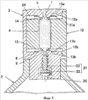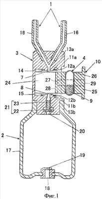 Кроме того, так как оба конца капсулы 4, установленной между переходным каналом 7 со стороны сопла и переходным каналом 8 со стороны насоса, испытывают давление со стороны периферийных участков 14 и 15 обоих переходных каналов 7 и 8, и входят с усилием в тесный контакт с периферийными участками 14 и 15, даже когда в капсулу 4 мгновенно подается большое количество распыляющего воздуха, нет опасений в том, что порошкообразное лекарственное средство 9 вытечет и будет рассеяно с обоих концов капсулы 4, сообщающейся с переходными каналами 7 и 8. Кроме того, когда в капсулу 4 мгновенно подается большое количество распыляющего воздуха и внутреннее давление капсулы 4 повышается, это обеспечивает давление обоих концов капсулы 4 изнутри капсулы на периферийные участки 14 и 15 переходных каналов 7 и 8, и тесный контакт между периферийными участками 14 и 15 и обоими концами капсулы 4 усиливается еще больше с обеспечением воздухонепроницаемого состояния между ними, протечки и рассеивание порошкообразного лекарственного средства 9 с обоих концов капсулы 4 может быть надежно предотвращено, и порошкообразное лекарственное средство можно доставлять и дозировать в необходимом количестве точно в полость носа. В данном варианте осуществления настоящего изобретения сопло 1 выполнено разветвленным, однако, сопло, используемое в данном изобретении, не ограничивается соплом разветвленного типа, а может быть выполнено в виде однотрубчатого сопла.