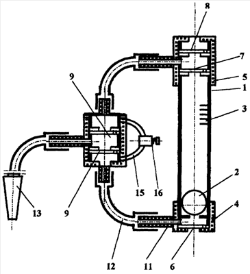 3.3. 2. Тренажер, состоящий из цилиндрического трубчатого корпуса 1 с постоянным по длине проходным сечением, в которое помещен, например, шаровидный указатель 2; шкалы 3, размещенной вдоль корпуса; нижней 4 и верхней 5 крышек корпуса; клапанов 6, 7, 8, 9 и 10, штуцеров 11, трубок 12 и мундштука 13, причем, клапанами оснащены нижняя и верхняя крышки, которые каналами или штуцерами с трубками соединены с блоком клапанов 14, в котором применен обходной канал, байпас 15, обобщающий полости этих трубок и содержащий регулятор 16 его проходного сечения, а два клапана 9 и 10 блока предназначены для переключения потока воздуха в полость со штуцером, трубкой и мундштуком 13 пациента.