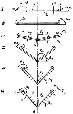 При этом углы подгибки полок по проходам принимают дифференцированными, причем минимальные величины углов – в чистовых (последних) проходах. Радиусы мест изгиба принимаются либо одинаковыми во всех проходах, либо последовательно уменьшающимися по ходу профилирования до конечной (заданной) величины.