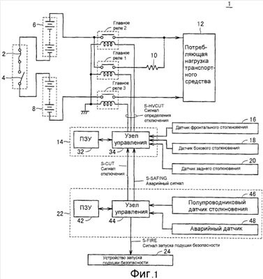 6. Автотранспортное средство (1), имеющее подушку безопасности, содержащее источник питания (6, 8) высокого напряжения, узел (SMR1-SMR3) отключения, предназначенный для отключения выхода источника питания высокого напряжения в ответ на сигнал на отключение источника высокого напряжения, устройство (24) запуска подушки безопасности, первый блок (22) управления, содержащий полупроводниковый датчик (46) столкновения, предназначенный для определения столкновения с транспортным средством, аварийный датчик (48) для определения столкновения независимо от полупроводникового датчика столкновения, первый узел (44) управления, предназначенный для формирования команды запуска на устройство запуска подушки безопасности, когда аварийный датчик обнаруживает столкновение и когда выходной сигнал полупроводникового датчика столкновения удовлетворяет определенному первому критерию, и для формирования сигнала на отключение источника питания высокого напряжения, когда аварийный датчик обнаруживает столкновение и когда выходной сигнал полупроводникового датчика столкновения удовлетворяет определенному второму критерию.