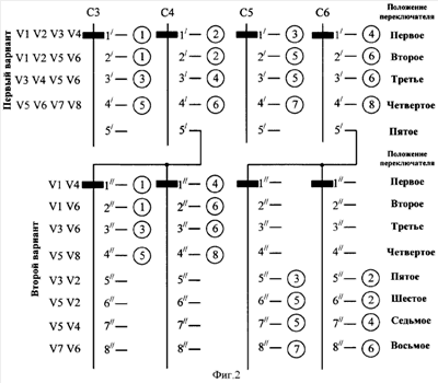 Первый вариант заключается в том, что сигналы управления подаются на четыре плеча ВИП, причем могут использоваться всевозможные варианты двухполупериодных мостовых схем выпрямления, состоящие из четырех плеч ВИП, образовывая однофазную мостовую схему из N-х мостов. В таблице 2 показан алгоритм первого варианта работы устройства, представленного на фиг.2. На фиг.2 показан один из вариантов устройства. Переключение проверяемых плеч производится двумя галетными переключателями, подвижный контакт которых показан прямоугольником, где 1′, 2′ и т.д. до 5′ и 1”, 2” и т.д. до 8” – это номера неподвижного контакта переключателя, где С3, С4, С5, С6 – сигналы управления выхода БУВИП, МСУД, подаваемые на третье, четвертое, пятое и шестое плечо ВИП в первой зоне. На фиг.2 показаны провода , и т.д. до , подходящие соответственно к первому, второму и т.д. и восьмому плечам ВИП. При установке первого переключателя в положение 5′ производится переключение устройства во второй вариант диагностики по двухплечевому варианту. В таблице 3 показан алгоритм второго варианта работы устройства, представленного на фиг.2.