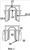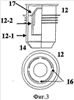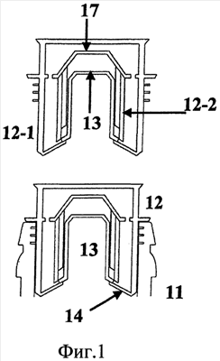 Внизу этого купола 17 имеется также второй цилиндрический корпус 12-2, концентричный или коаксиальный первому корпусу 12-1 выливной части 12; аналогичным образом второй корпус 12-2 имеет цилиндрическую трубчатую секцию более короткой длины, чем трубчатая секция первого цилиндрического корпуса 12-1, т.е. второй трубчатый корпус 12-2, который проходит в направлении внутреннего пространства первого трубчатого корпуса 12-1 выливной части.