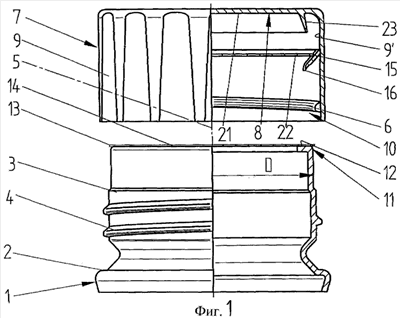 На фиг. 1 показана опорная зона 2 бутылки 1 с горлышком 3, которое имеет наружную резьбу 4 и среднюю ось 5. Кроме того, показан имеющий внутреннюю резьбу 6 винтовой колпачок 7, который так же, как бутылка 1, может состоять, например, из пластмассы, такой как полиэтилен или полиэтилентерефталат. Этот винтовой колпачок 7 снабжен закрывающим участком 8 и имеющим внутреннюю резьбу 6 гильзообразным участком 9 с отверстием 10 для навинчивания на наружную резьбу 4 имеющего кромку 11 горлышка 3 бутылки 1 и свинчивания с нее.