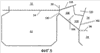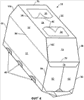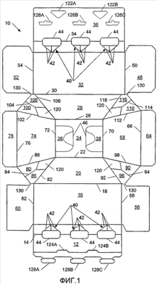 Как показано на Фиг.1, заготовка 10 выполнена симметрично вокруг горизонтальной линии симметрии, что способствует эффективности изготовления настоящей коробки. Однако коробке нет необходимости иметь такую симметрию. Заготовка 10 является прямоугольной с прямыми кромками, которые предусматривают эффективную компоновку заготовок на полотне картона, из которого вырезаются заготовки. Заготовка 10 имеет полости для пальцев 38, образованные в верхних панелях для удобства при переноске наполненной коробки. Эти полости для пальцев 38 показаны как пустоты или отверстия в заготовке, приспособленные для размещения пальцев человека для переноски коробки, однако могли бы быть сформированы в качестве откидных клапанов для пальцев, отделяемых вдоль отрывных линий, позволяющих удалить откидные клапаны для пальцев из или вдавить их в верхнюю панель. Полости для пальцев 38 могут включать смежные линии сгиба 46, позволяющие часть верхней панели сгибать внутрь для дальнейшего использования и для комфортной переноски.