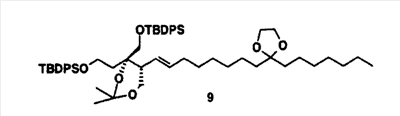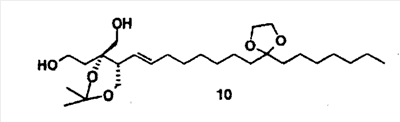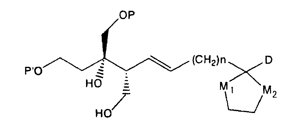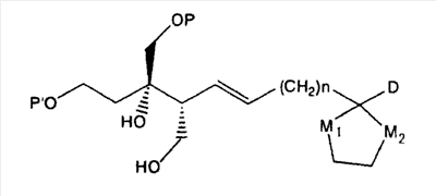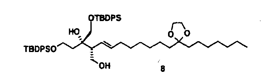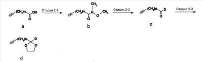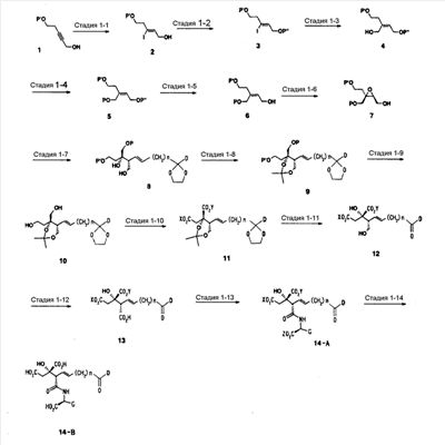 (где Е и G имеют такие же значения, какие указаны выше, и Z представляет собой неразветвленную или разветвленную алкильную группу или защитную группу карбоксильной группы) в присутствии основания и агента сочетания с получением соединения, представленного формулой: (где А, D, E, G, X, Y и Z имеют такие же значения, какие указаны выше) и затем, при необходимости, обработку данного соединения для проведения гидролиза, восстановления, аминирования или амидирования, гидроксииминирования и/или превращения эфира, чтобы получить требуемое соединение формулы (I). Ниже поясняется пример способа синтеза соединения, представленного формулой (I) настоящего изобретения, с применением следующей схемы реакций. Общий способ получения 1 В вышеуказанных формулах каждый из символов имеет такие же значения, как значения, приведенные в вышеуказанной формуле (I), и каждый из Р, P’ и P” представляет собой гидроксизащитную группу. Исходное соединение в форме соединения 1 можно синтезировать по способу, описанному в литературе (J. Org. Chem. 1989, 45, 5522, B.E. Marron, et al.). Стадия 1-1 После взаимодействия соединения 1 с восстанавливающим агентом, таким как бис-(2-метоксиэтокси)алюминийнатрийгидрид или алюминийлитийгидрид, в растворителе, таком как различные простые эфиры, такие как диэтиловый эфир, тетрагидрофуран или диоксан, или бензол, толуол или циклогексан или смесь таких растворителей, при комнатной температуре или охлаждении, предпочтительно, при температуре ниже температуры льда, соединение 2 может быть получено обработкой йодом при охлаждении, предпочтительно, при температуре -78°С. Стадия 1-2 Соединение 2 затем подвергают взаимодействию с дигидропираном в растворителе, таком как диэтиловый эфир, толуол, циклогексан, метиленхлорид, хлороформ, 1,2-дихлорэтан или этилацетат или смесь таких растворителей, и в присутствии каталитического количества кислоты, такой как пара-толуолсульфонат пиридиния, толуолсульфоновая кислота, метансульфоновая кислота, уксусная кислота, трифторуксусная кислота или разбавленная хлористоводородная кислота, либо при комнатной температуре, либо при охлаждении, предпочтительно, при температуре ниже температуры льда, получая при этом соединение 3. Стадия 1-3 Соединение 3 подвергают взаимодействию с сильным основанием, таким как трет-бутилитий, н-бутиллитий или втор-бутиллитий, в растворителе, таком как различные простые эфиры, такие как диэтиловый эфир, тетрагидрофуран или диоксан, или бензол, толуол или циклогексан или смесь таких растворителей, при комнатной температуре или при охлаждении, предпочтительно, при температуре -78°С, с последующим добавлением формальдегида и предоставлением возможности для взаимодействия смеси при охлаждении, предпочтительно, при температуре ниже температуры льда, с получением соединения 4. Стадия 1-4 Соединение 4 подвергают взаимодействию с трет-бутилдифенилхлорсиланом в растворителе, таком как N,N-диметилформамид, тетрагидрофуран, метиленхлорид или хлороформ или смесь таких растворителей, и в присутствии основания, такого как имидазол, триметиламин или пиридин, либо при комнатной температуре, либо при охлаждении, предпочтительно, при температуре ниже температуры льда, с получением соединения 5. Стадия 1-5 Соединение 5 подвергают взаимодействию в различных спиртовых растворителях, таких как этанол, мет