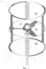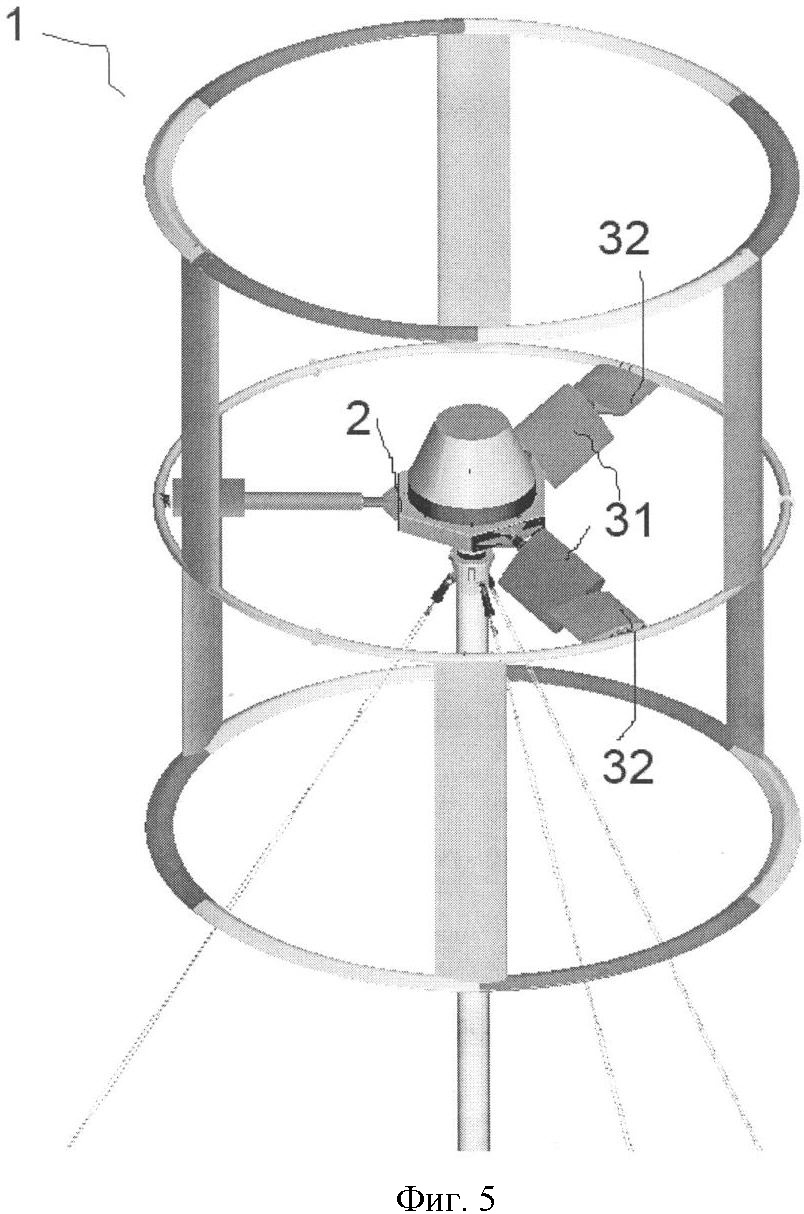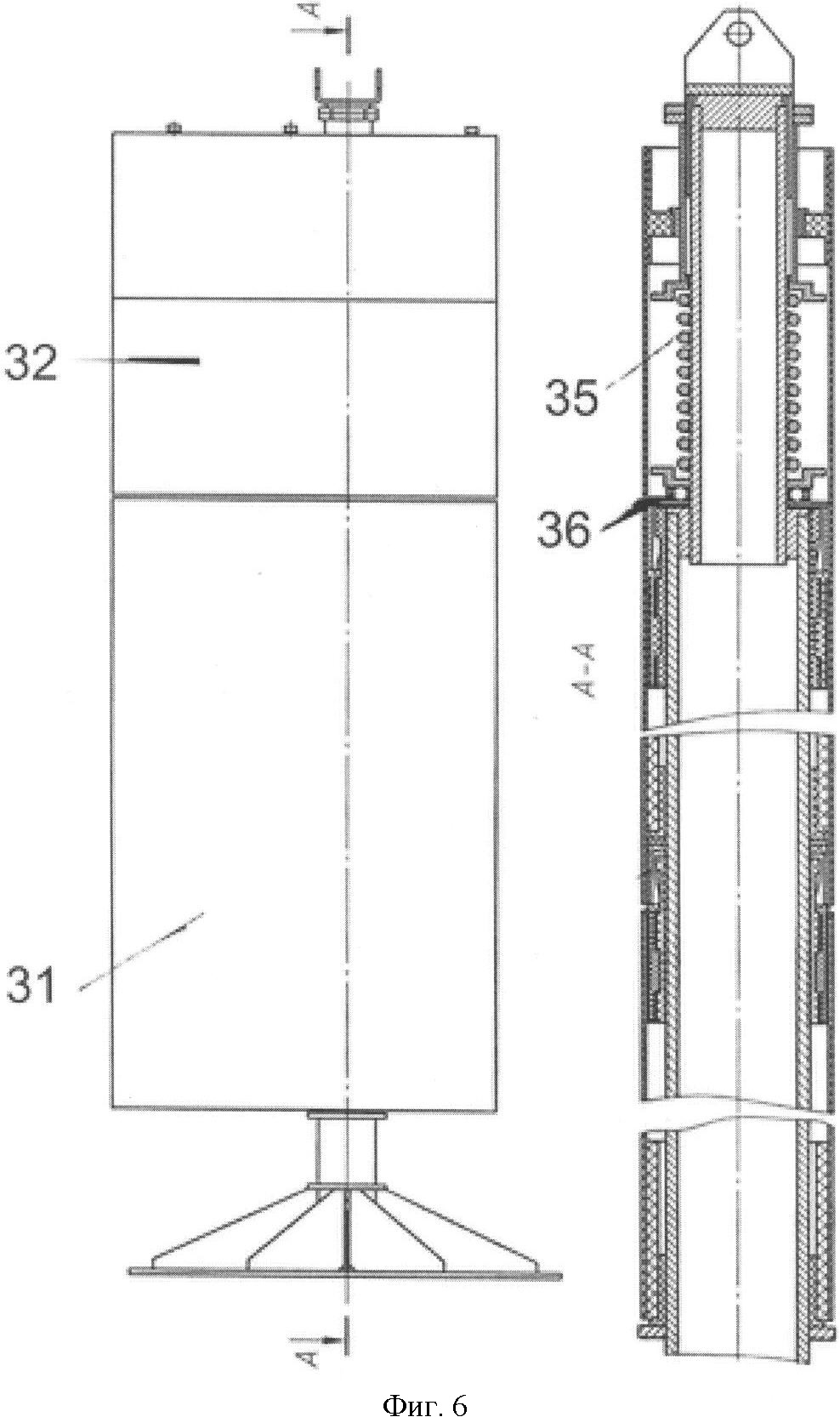 На фиг.5 виден случай, когда ротор вращается с максимальной скоростью, части аэродинамических тормозов 32 и 31 отклонены при этом в разные стороны, обеспечивая тем самым малый уровень колебаний, обусловленный несбалансированными вертикальными силами. На фиг.6 показан аэродинамических регулятор, состоящий из двух аэродинамических поверхностей 31 и 32, отклоняемых в разные стороны. При малых скоростях вращения эти поверхности находятся в одной плоскости, удерживаемые поджатой пружиной 35. При увеличении оборотов до максимальных части 31 и 32 под действием центробежной силы сжимают пружину 35 и, двигаясь по винтовым линиям, отклонятся до 60 градусов от положения равновесия, оказывая тормозящее действие на ротор.