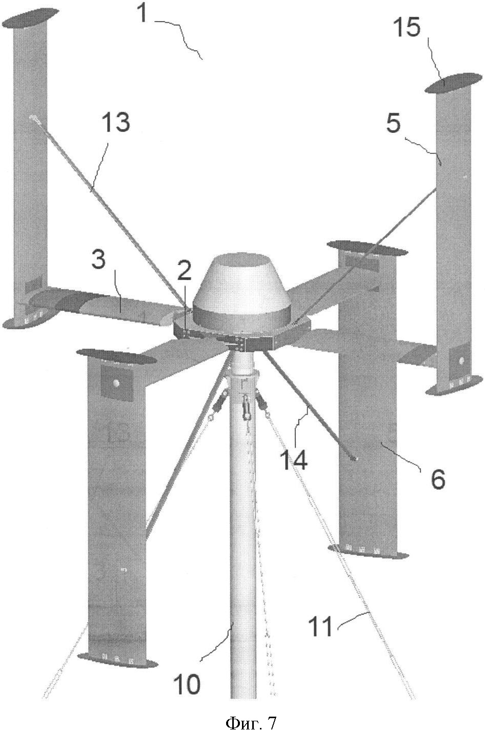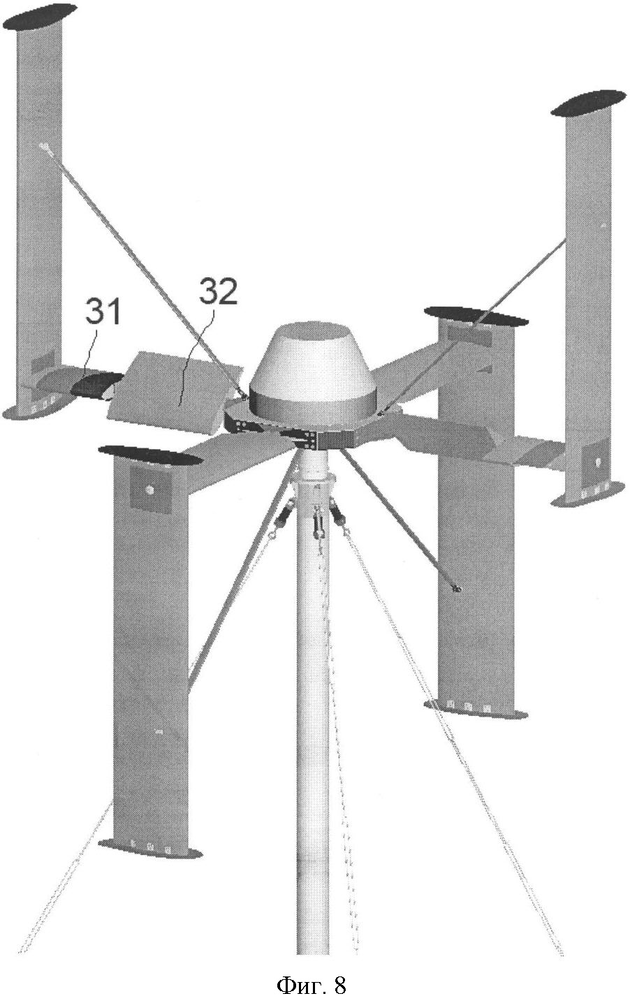 Фиг.7 демонстрирует вариант конструкции ротора, когда лопасти крепятся непосредственно на концах траверс. На фиг.8 показано положение аэродинамических тормозов при максимальной скорости вращения.
